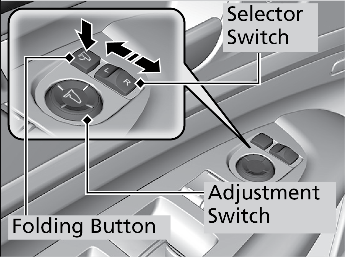 Mirror position adjustment switch: Press the switch left, right, up, or down to move the mirror.