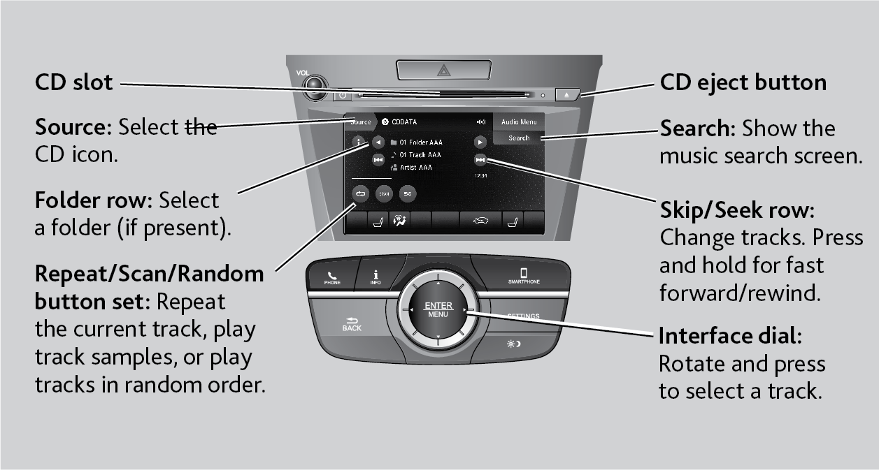 The audio system supports audio CDs, CD-Rs, and CD RWs in MP3, WMA, or AA formats. Insert a CD to begin automatic payback.