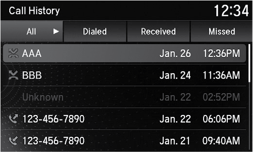 For Call History, move the interface dial to the right and scroll through the list (All, Dialed, Received or Missed).