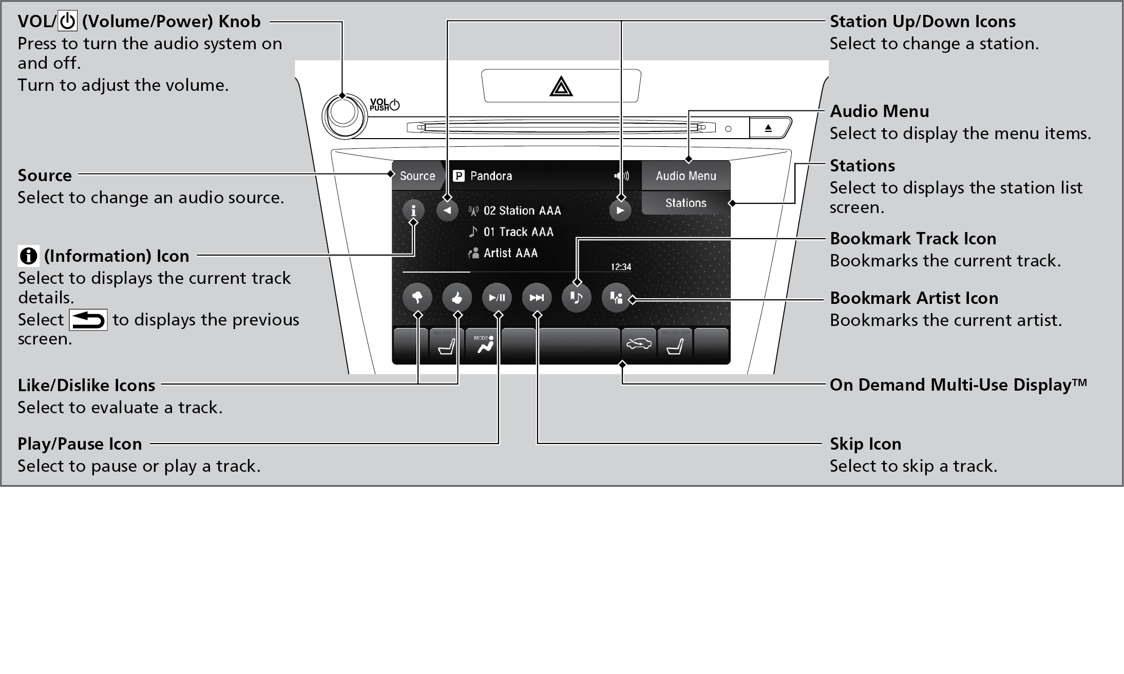 Your audio system allows you to listen to music from the Pandora® app on a compatible smartphone. This function is available when the phone is paired and connected to the vehicle’s Bluetooth® HandsFreeLink ® system, or with an iPhone®, you can connect using your USB cable to the USB port.
