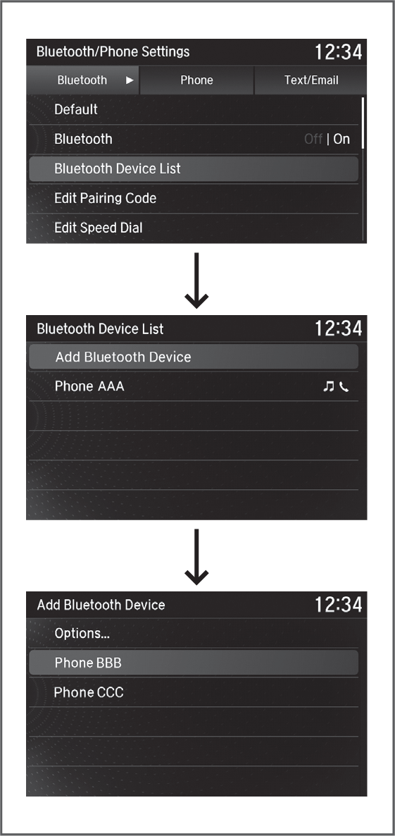 Repeat the procedure to select Bluetooth® Device List, then Add Bluetooth® Device.