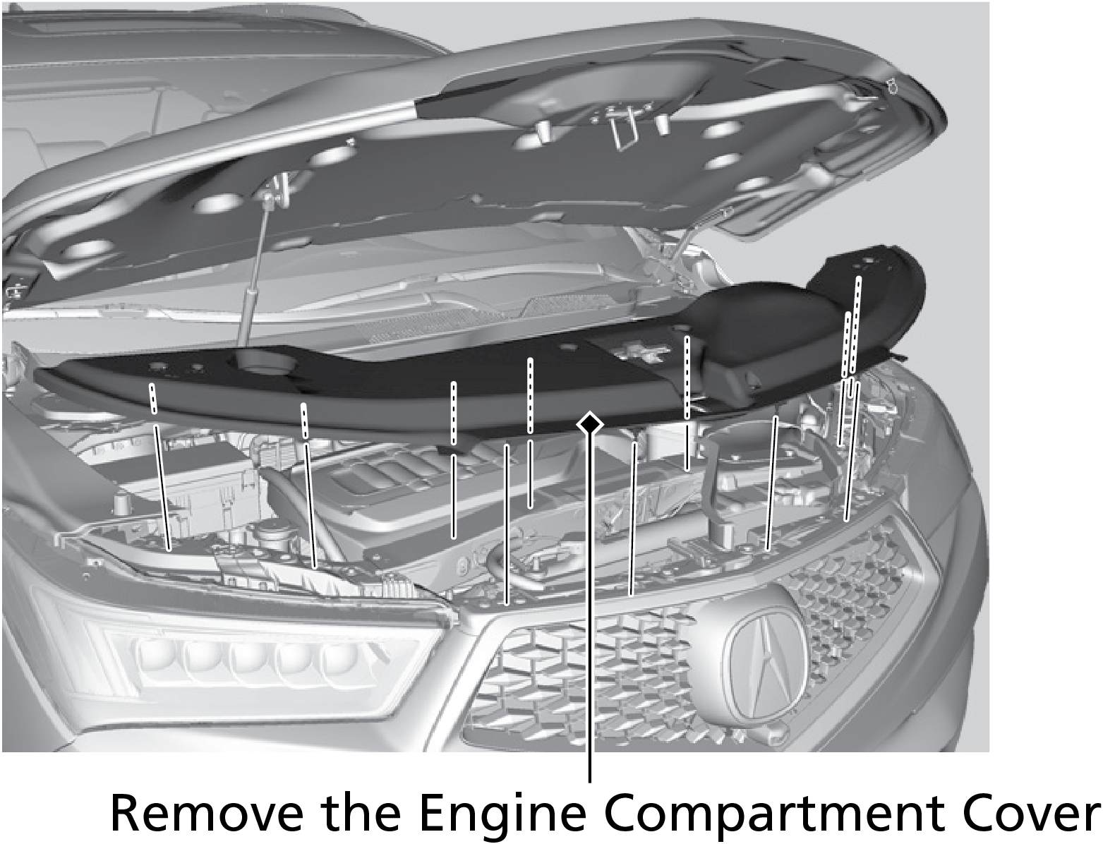 The component parts in the engine compartment are protected by a cover. You may need to remove the cover when you perform certain maintenance work.