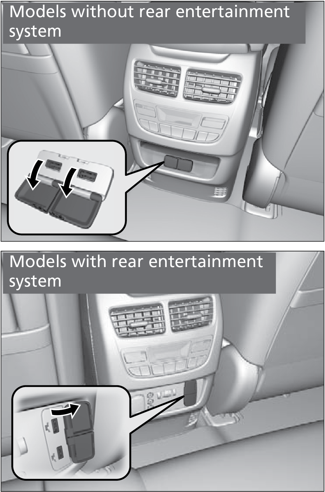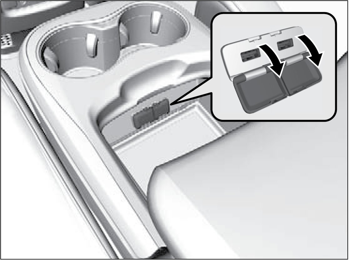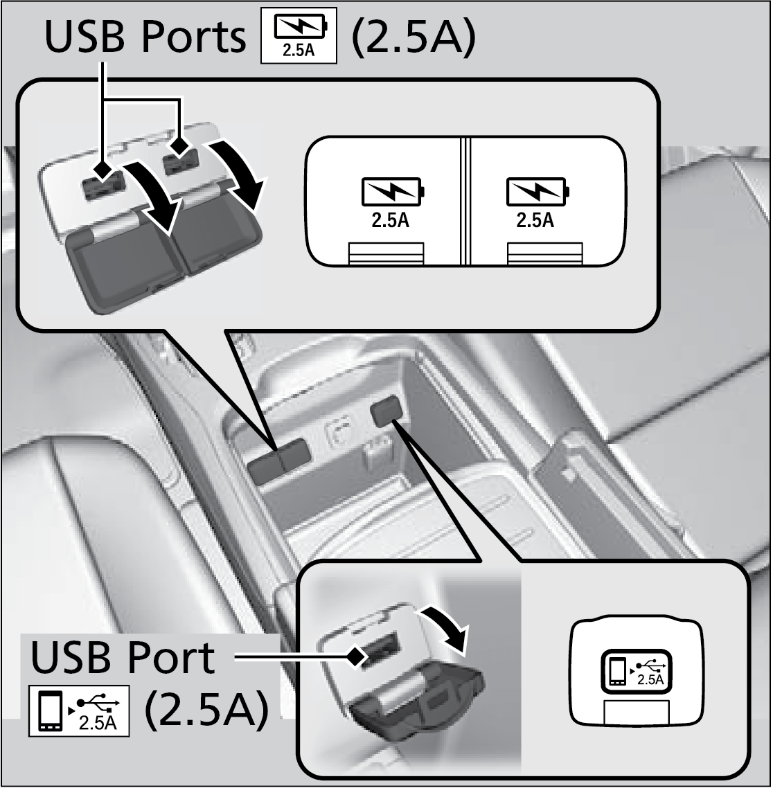 The USB port (2.5A) is for charging devices, playing audio files and connecting compatible phones with Apple Carplay™ or Android Auto™.