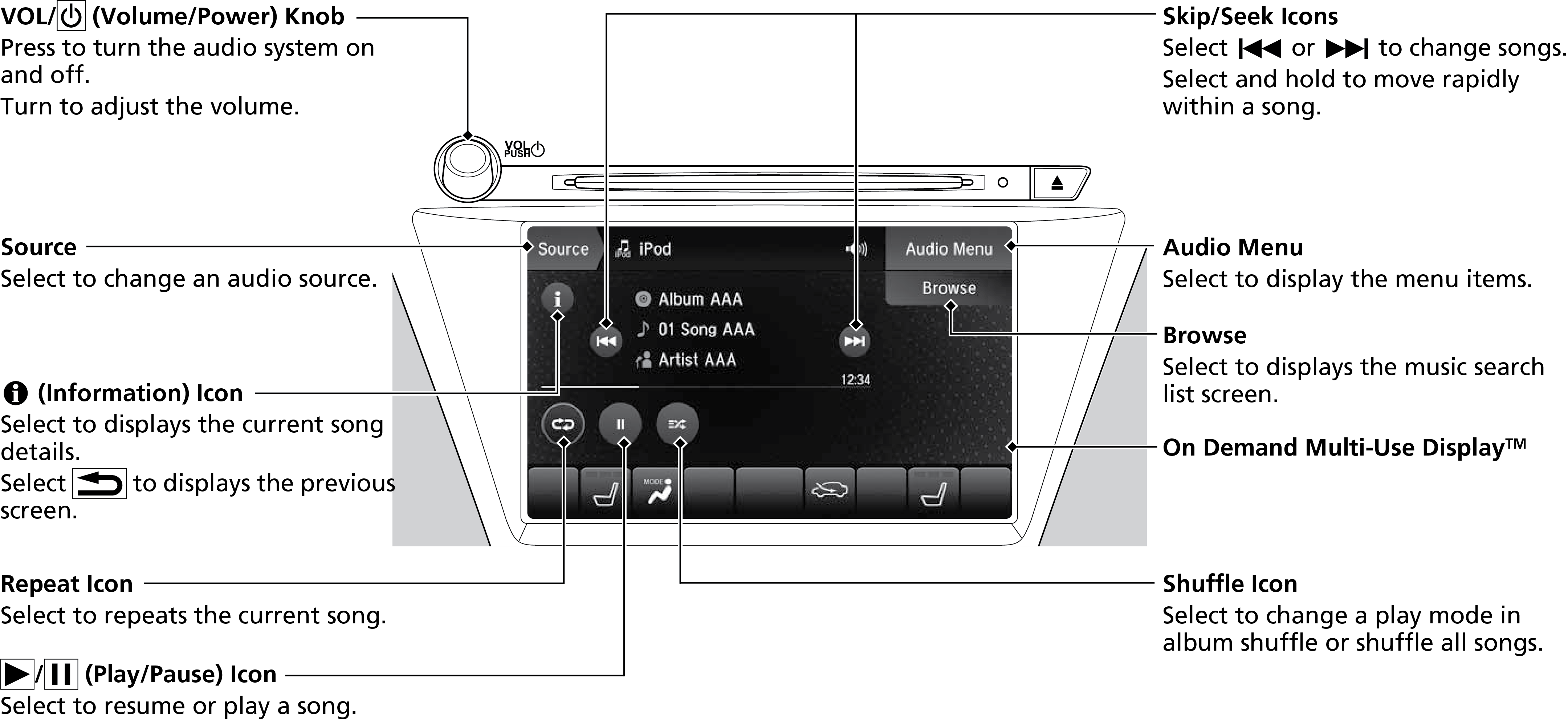 Play and operate an iPod®*14 through the vehicle’s audio system. Connect your device to the USB port (see USB Port).