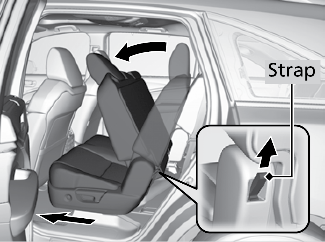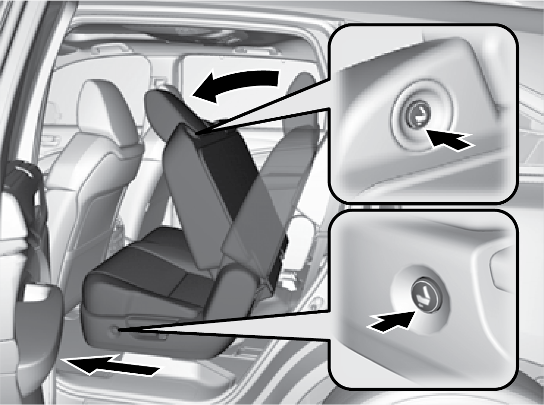 Pressing the button on the seat-back or seat cushion tilts the second row outer seat's seat-back forward. The whole seat slides forward.