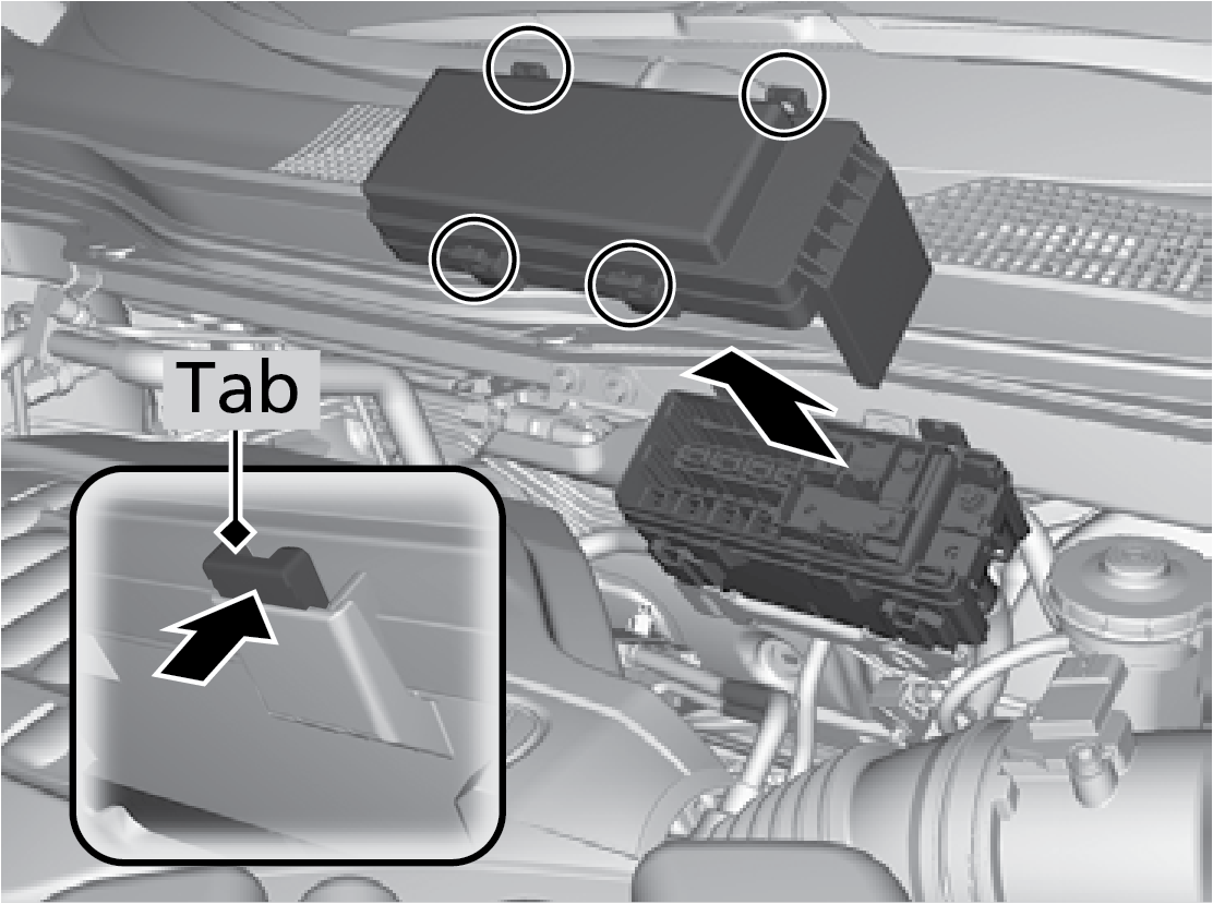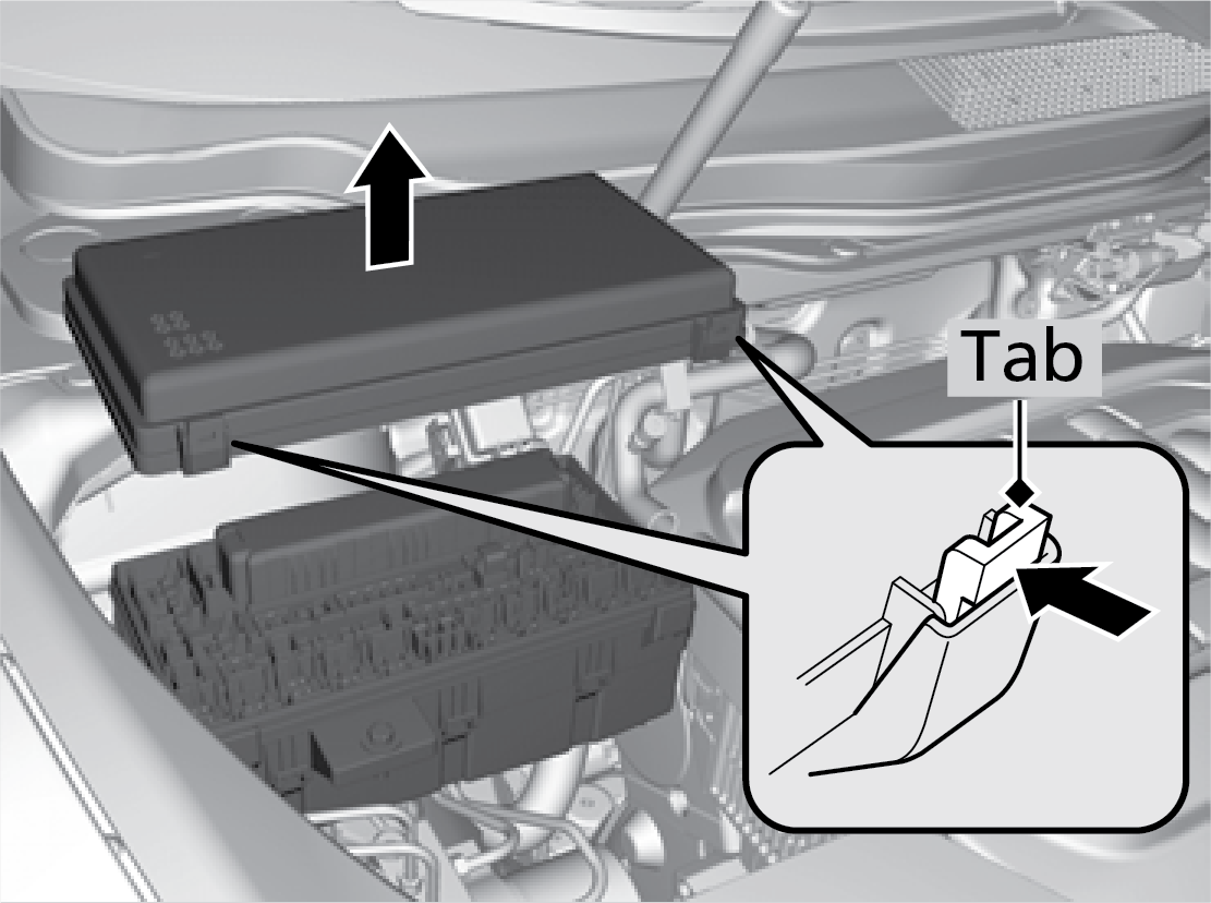 Located near the brake fluid reservoir. Push the tabs to open the box.