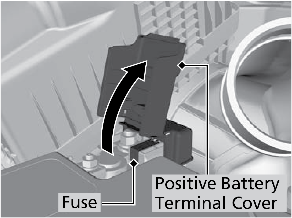 Located near the + terminal on the battery. Remove the cover on the + terminal (as shown). Replacement of this fuse should be done by a dealer.