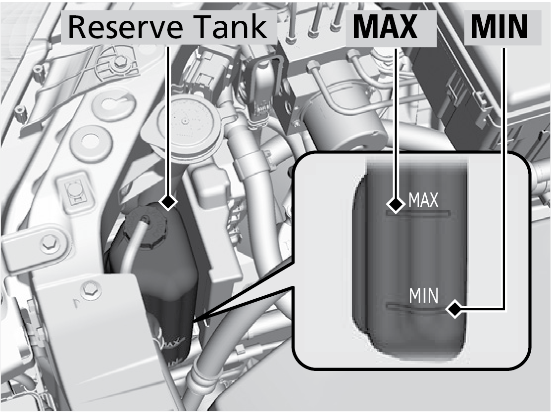 - Once the engine has cooled down, inspect the coolant level and check the cooling system components for leaks. If the coolant level in the reserve tank is low, add coolant until it reaches the MAX mark. If there is no coolant in the reserve tank, make sure the radiator is cool, then cover the radiator cap with a heavy cloth and open the cap. If necessary, add coolant up to the base of the filler neck, and put the cap back on.
