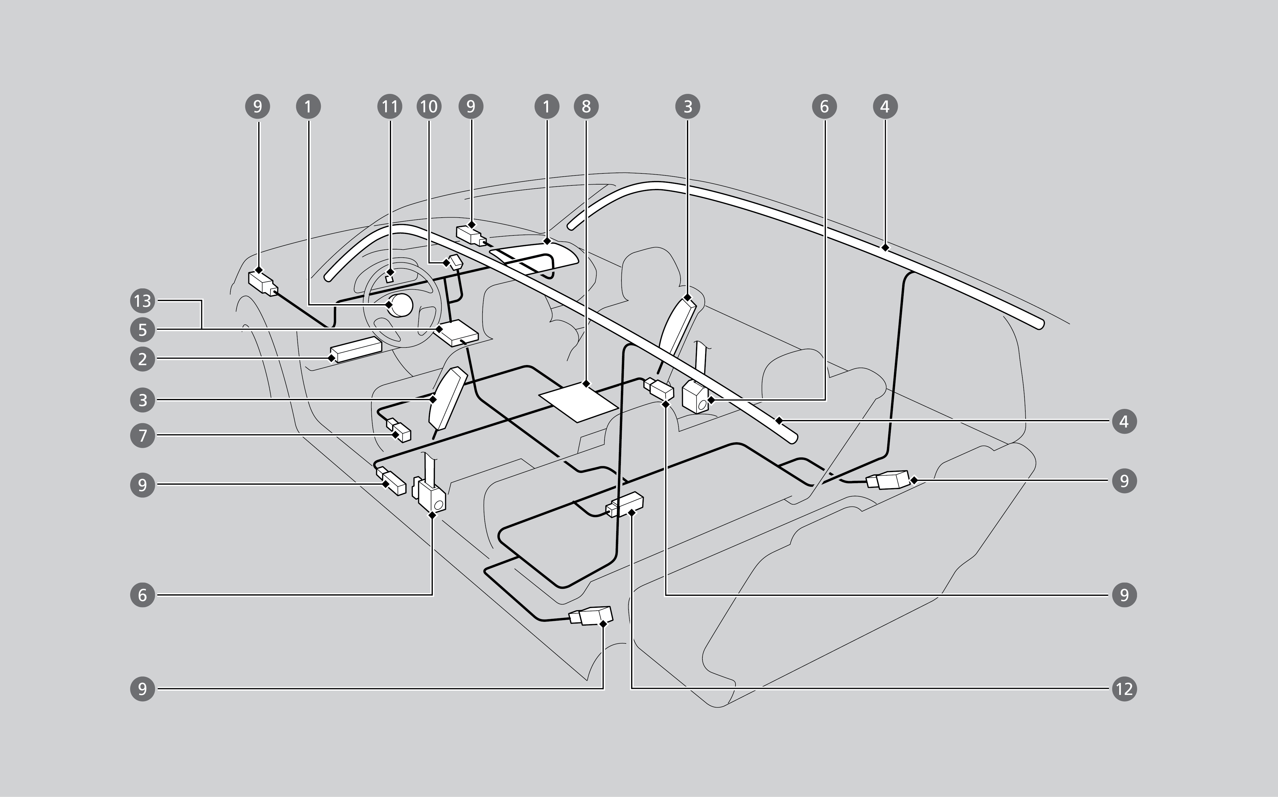 Two side curtain airbags, one for each side of the vehicle. The airbags are stored in the ceiling, above the side windows. The front and rear pillars are marked SIDE CURTAIN AIRBAG.