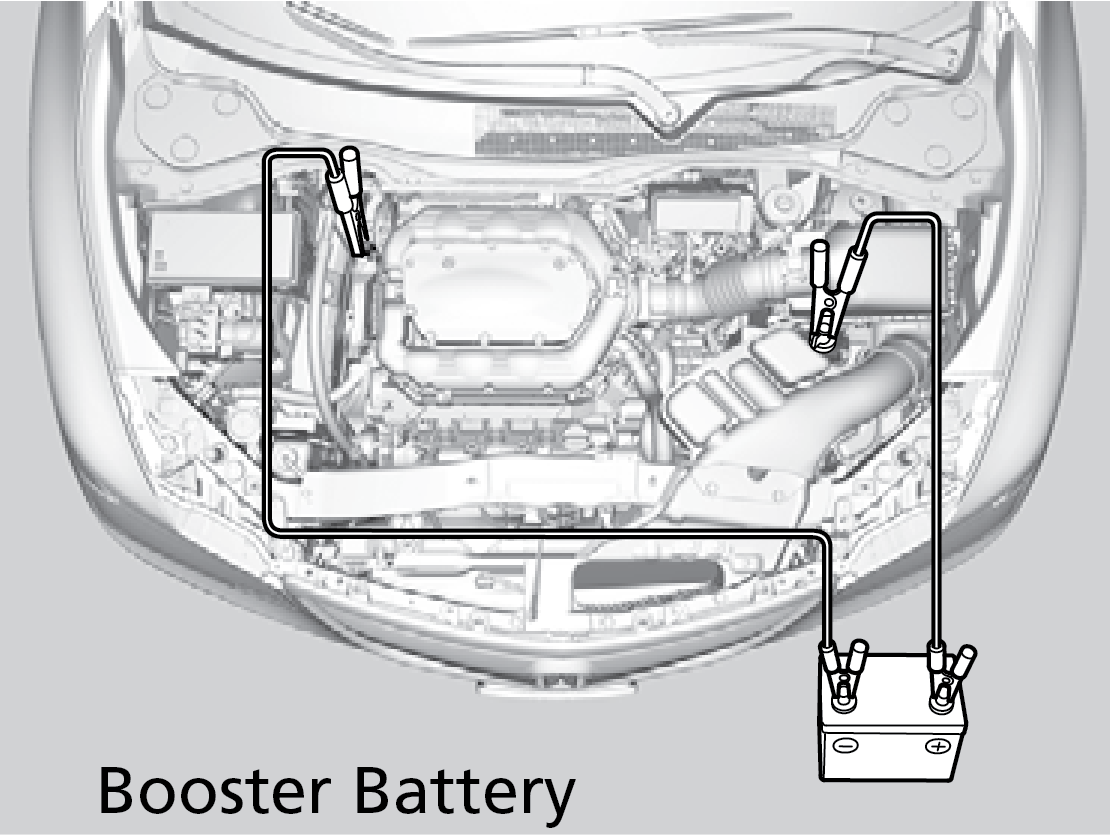 - Connect the other end of the first jumper cable to the booster battery (+) terminal. Use a 12-volt booster battery only.