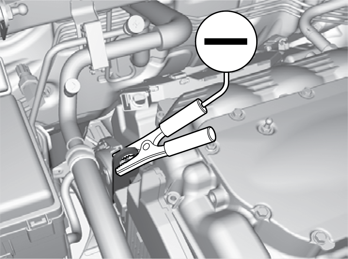 - Connect the other end of the second jumper cable to the engine hanger as shown. Do not connect this jumper cable to any other part.