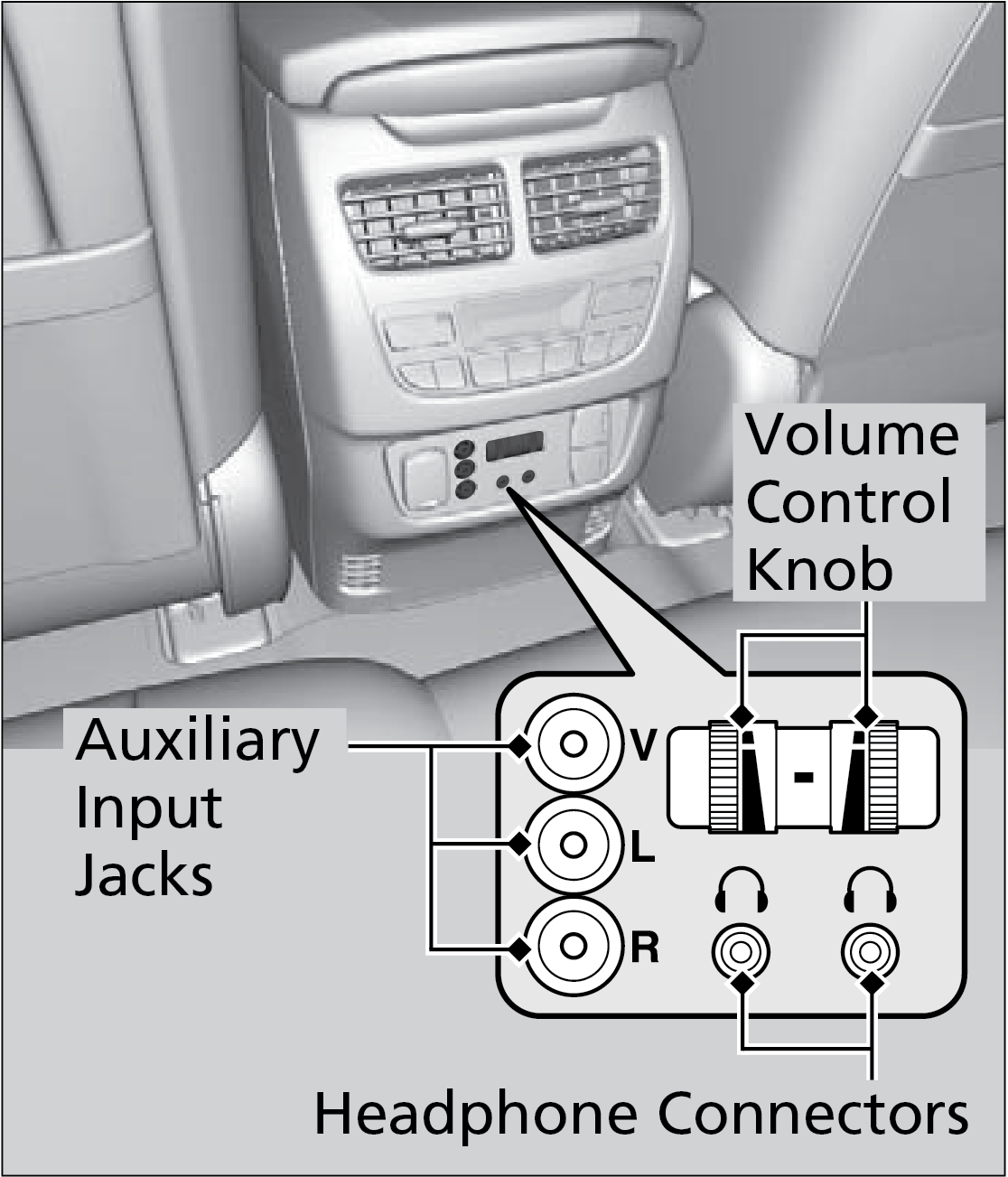 The headphones can also be used by connecting to the auxiliary console panel. There are two headphone connectors for the rear passengers. Each connector has its own volume control.