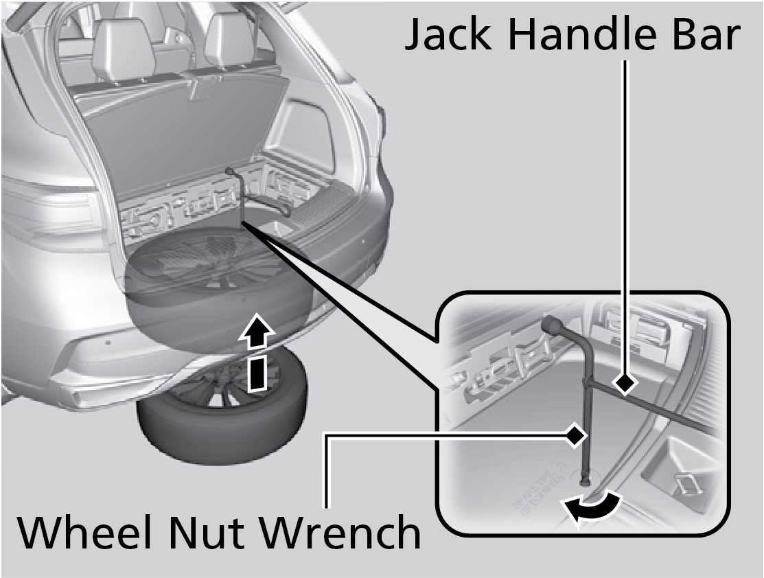 tire. Turn the wheel nut wrench with the jack handle bar clockwise until the flat