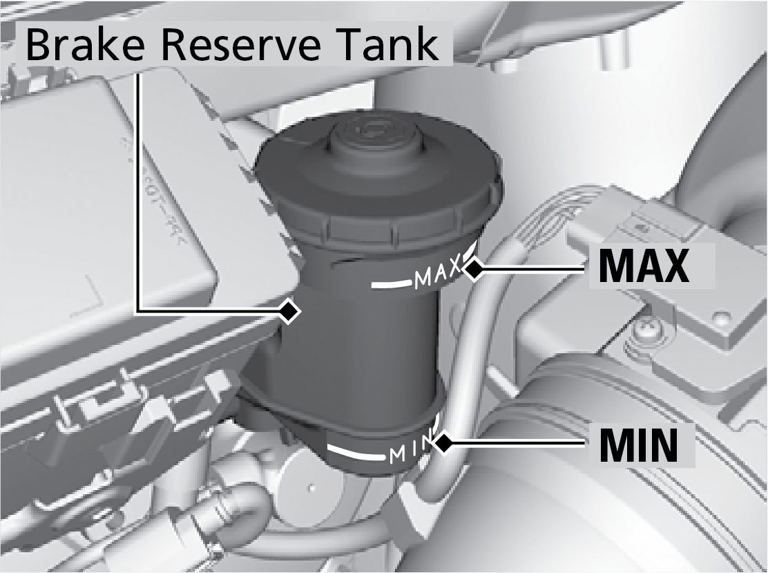 If the fluid level is at or below the MIN mark, have a dealer inspect for leaks or worn brake pads as soon as possible.
