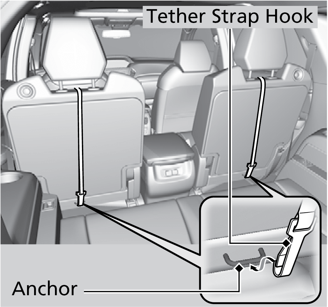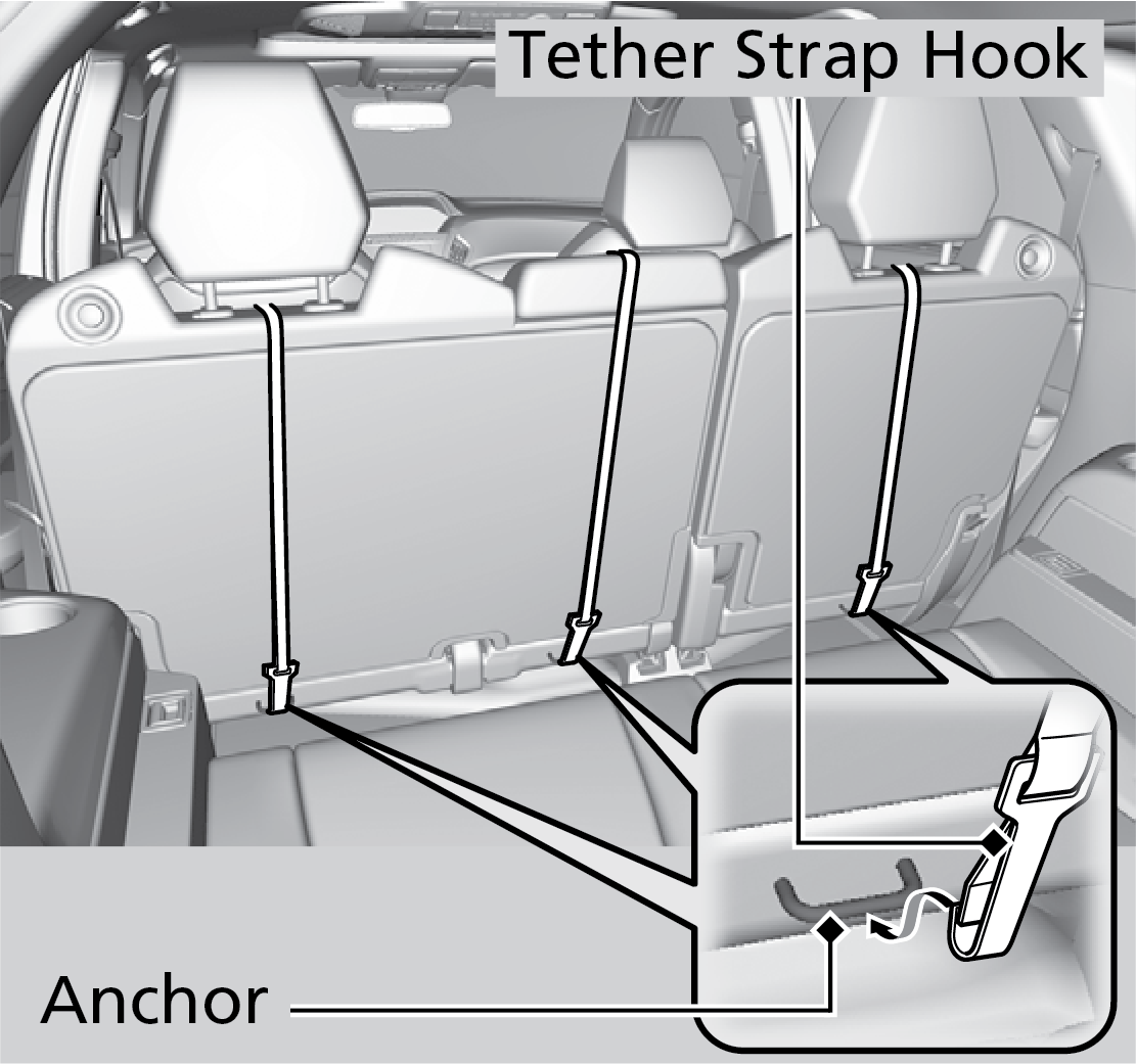 Put the outer head restraint to its upper-most position, then route the tether strap between the head restraint legs, and secure the tether strap hook to the anchor. Make sure the strap is not twisted.