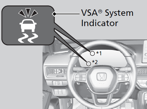 The VSA® may not function properly if tire type and size are mixed. Make sure to use the same size and type of tire, and the air pressures as specified.When the VSA® system indicator comes on and stays on while driving, there may be a problem with the system. While this may not interfere with normal driving, have your vehicle checked by a dealer immediately.The Vehicle Stability AssistTM (VSA®) system, Vehicle Stability AssistTM (VSA®) OFF*, Adaptive Cruise Control (ACC) with Low Speed Follow*/Adaptive Cruise Control (ACC)*, low tire pressure/TPMS* and safety support indicators may come on in amber along with a message in the gauge when you set the power mode to ON after reconnecting the battery.