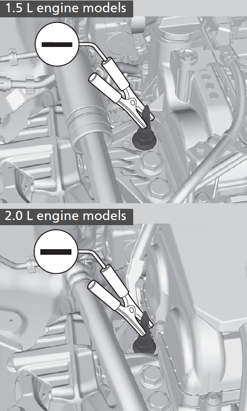 - Connect the other end of the second jumper cable to the stud bolt as shown. Do not connect this jumper cable to any other part.