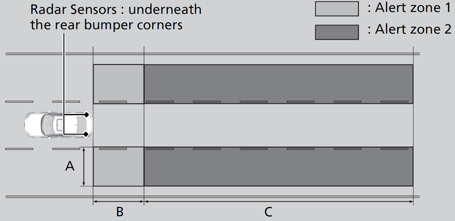 C: Approx. 10 ~ 82 feet (3 ~ 25 meters) behind from rear bumper. (The faster the approaching vehicle, the further away it will be detected.)