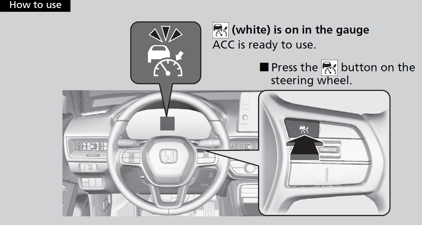 When the engine speed slows down, try to downshift. When the engine speed goes up, try to upshift. You can maintain the set speed if you change gear within five seconds.When not using ACC: Turn off adaptive cruise by pressing the