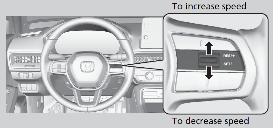Increase or decrease the vehicle speed using the RES/+/SET/−switch on the steering wheel.