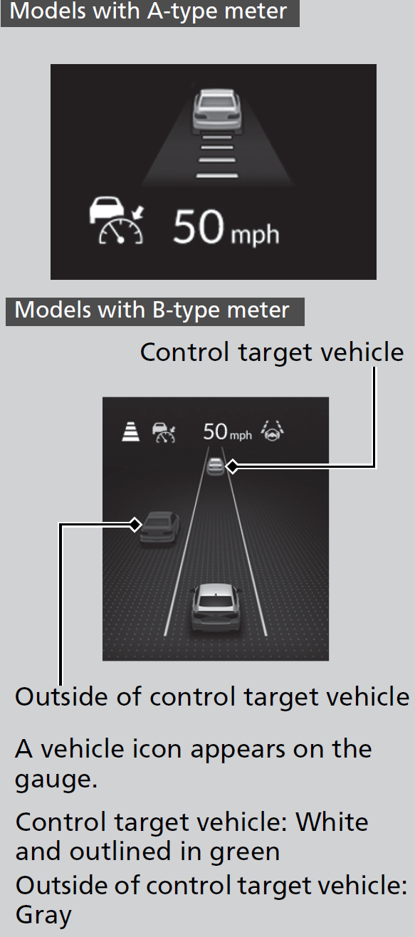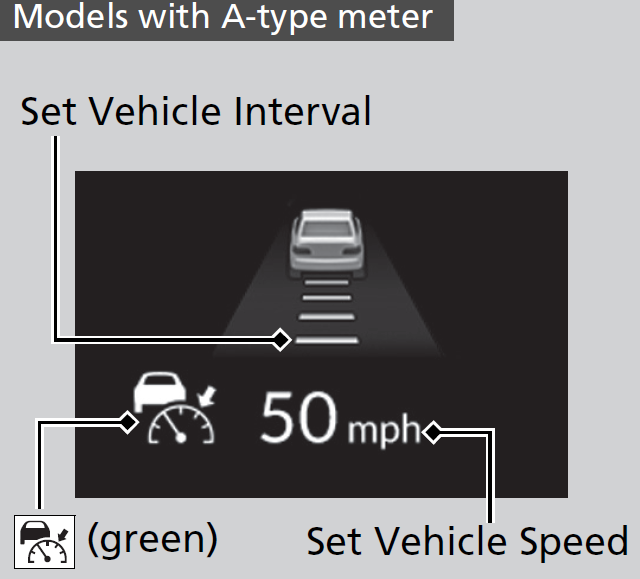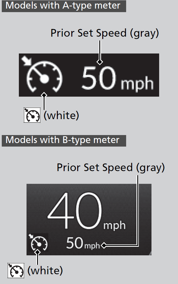 When you turn the ACC off by pressing the CANCEL button or depressing the brake pedal, the prior set speed is displayed on the gauge in gray.