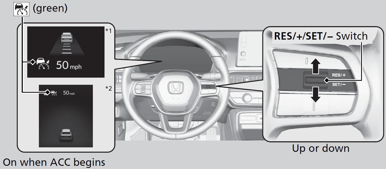 When pressing the RES/+/SET/− switch up, the ACC is activated with displayed speed.