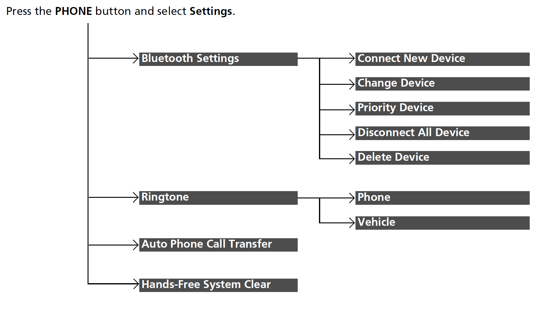 While the vehicle is at a complete stop with the power mode in ON, press the MENU button. To customize the phone settings, press the PHONE button, then select Settings.