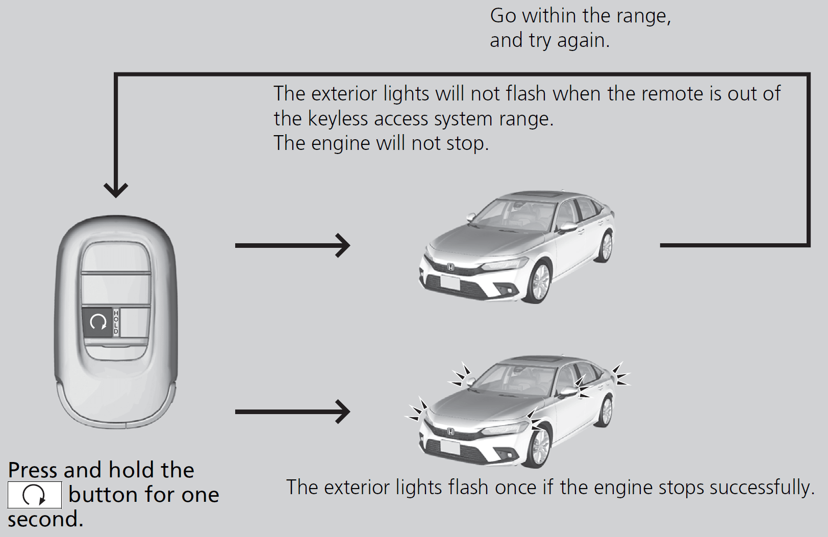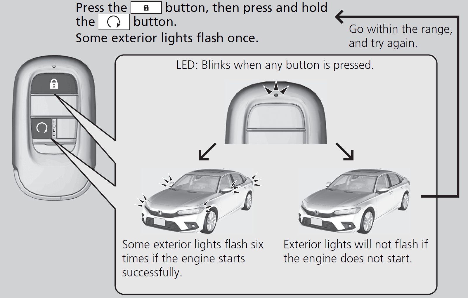 This distance may vary by external electrical interference.The engine may not start by the remote engine start if:- You have disabled a remote engine start setting.