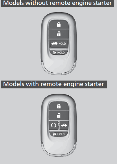 If the keys do not work properly, have them inspected by a dealer.Models with remote engine starterYou can remotely start the engine using the remote engine start.