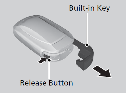 To remove the built-in key, push the release button and then pull out the key. To reinstall the built-in key, push the built-in key into the keyless remote until it clicks.