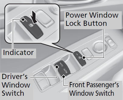 When the power window lock button is pressed, the indicator comes on and you can only operate the driver’s window. Turn the power window lock button on if a child is in the vehicle.