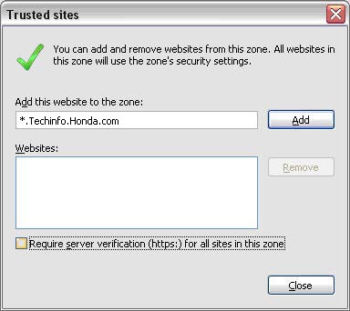 9. Click on the Close button once *techinfo.honda.com is listed in the "Add this Website to the zone" box.