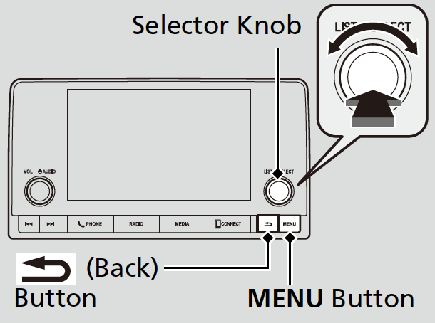 Selector knob: Rotate left or right to scroll through the available choices. Press