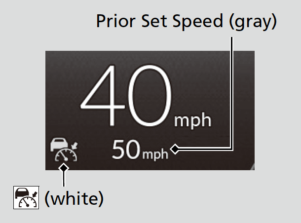 When you turn the cruise control off by pressing the CANCEL button or depressing the brake pedal, the prior set speed is displayed on the gauge in gray.