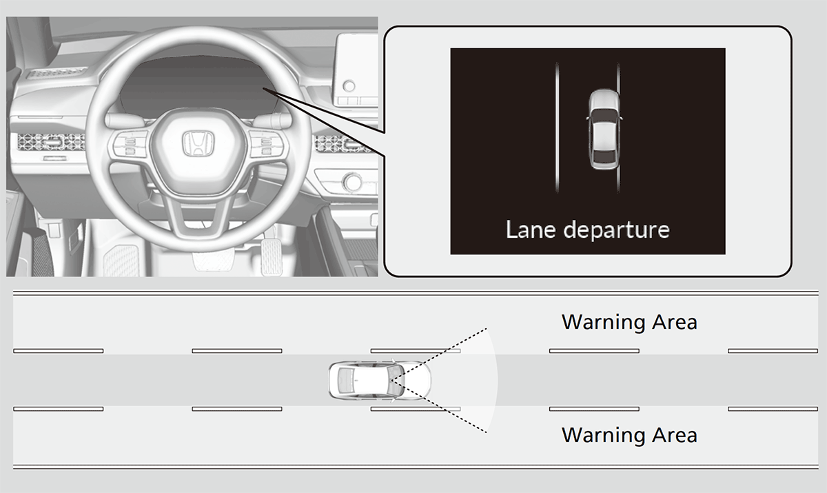 When the vehicle enters the warning area, the LKAS alerts you with slight steering wheel vibration as well as a warning display.