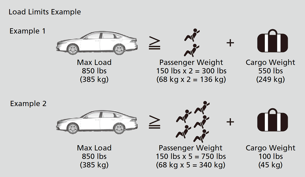 The maximum load for your vehicle is 850 lbs (385 kg). See the Tire and Loading Information label attached to the driver’s doorjamb.