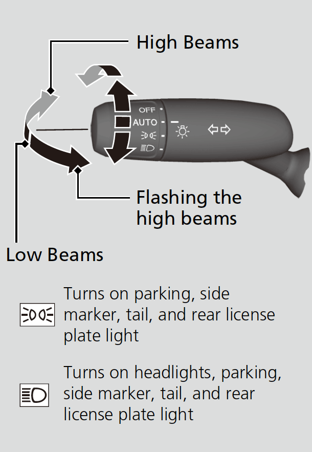 Do not leave the lights on when the engine is off because it will cause the battery to discharge.If you suspect that the headlights are not positioned properly, have the vehicle inspected by a dealer.