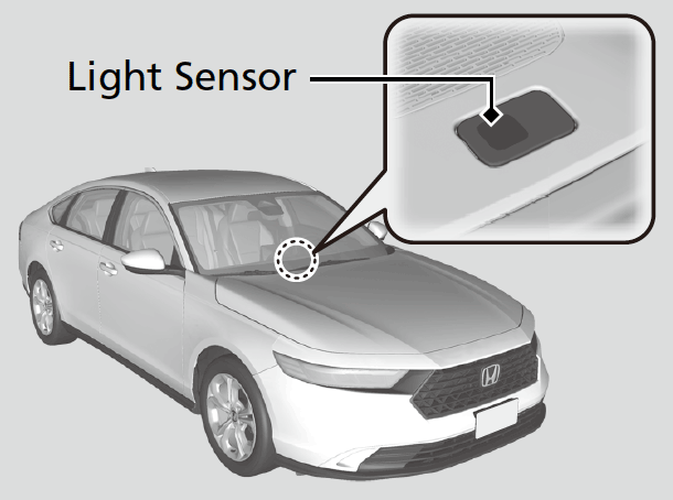 We recommend that you turn on the lights manually when driving at night, in a dense fog, or in dark areas such as long tunnels or parking facilities.The light sensor is in the location shown below.