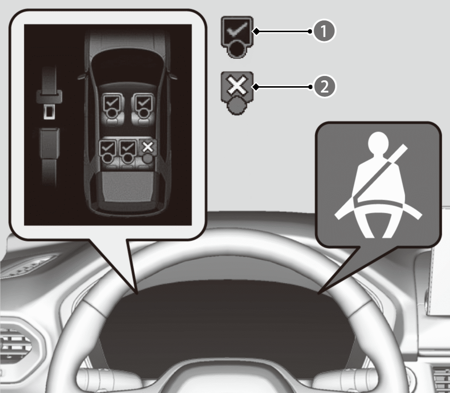 - An unfastened red graphic indicates the seat belt is unfastened and an occupant has been detected.