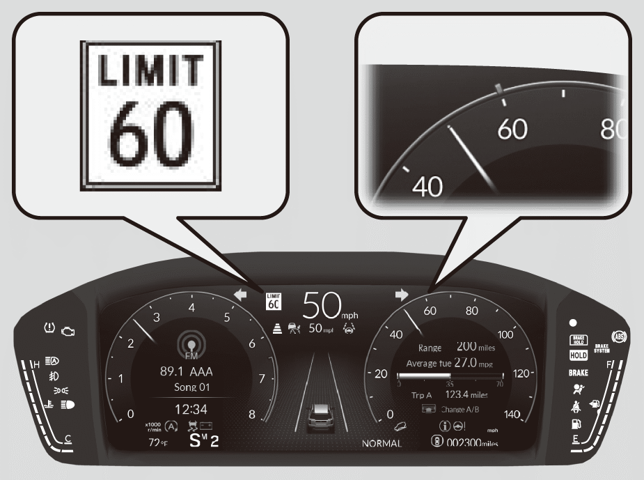 Shows certain detected traffic signs while driving. If speed limit warning is activated, the sign icon blinks when the maximum speed of the traffic sign detected is exceeded by a threshold, when compared with the vehicle speed.