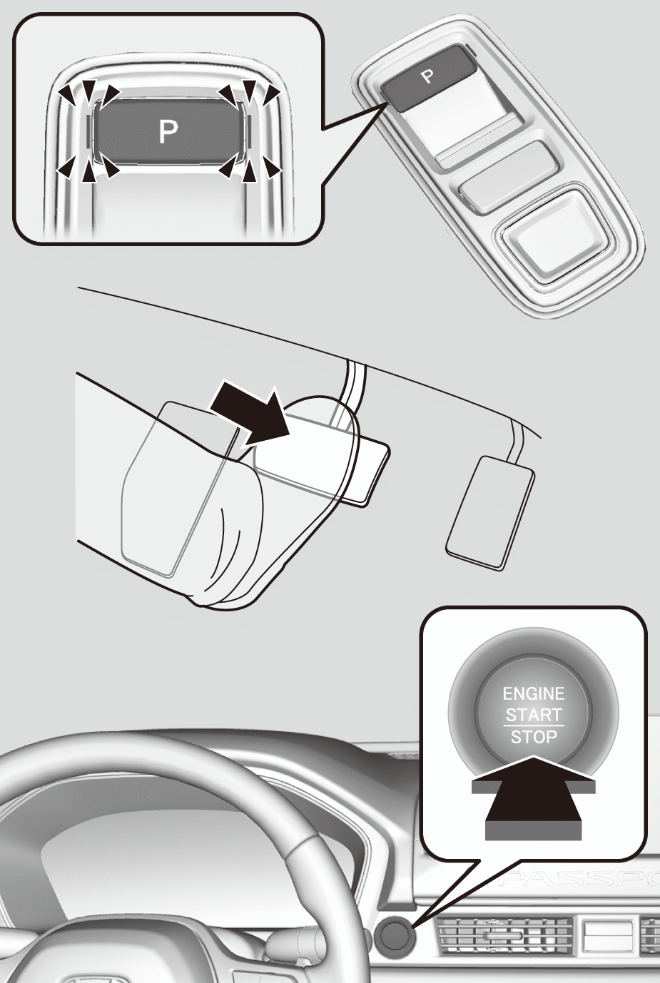 - Depress the brake pedal, then press the ENGINE START/STOP button while the transmission is in P.