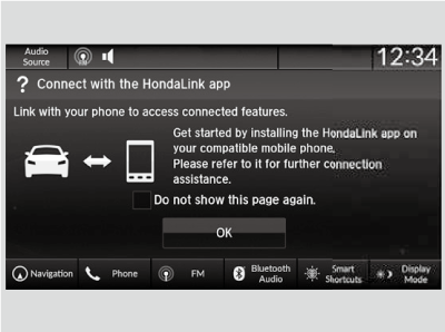 You can see the connection guide screen after launching HondaLink® when there is no connection to a network. If you do not need this guide, select check-box and select OK.