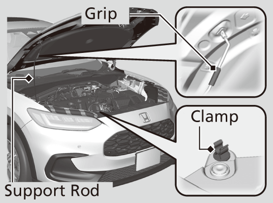 When closing, remove the support rod and stow it in the clamp, then gently lower the hood. Remove your hand at a height of approximately 12 inches (30 cm) and let the hood close.