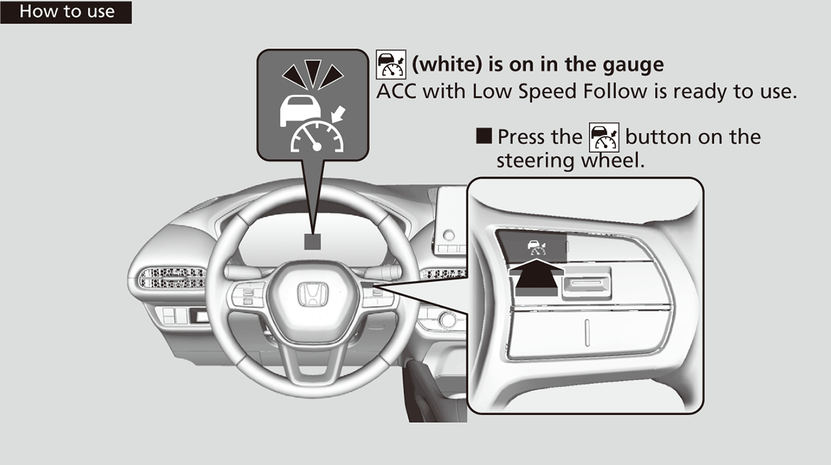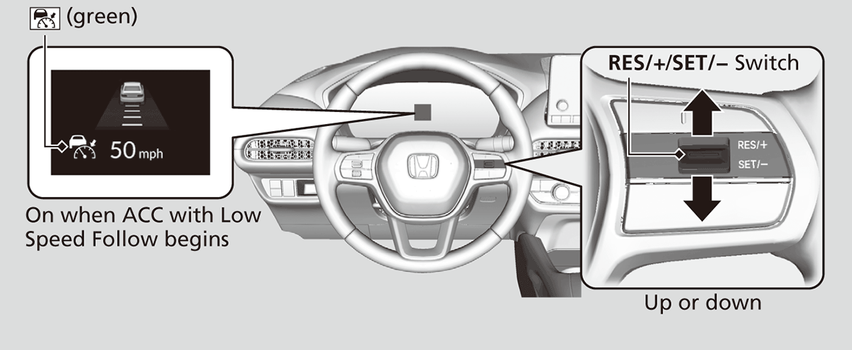 Resuming the prior set speed: After you have canceled ACC with Low Speed Follow, you can activate the ACC with Low Speed Follow with the prior set speed displayed on the gauge (in gray) by pressing the RES/+/SET/− switch up even if the vehicle is stopped.