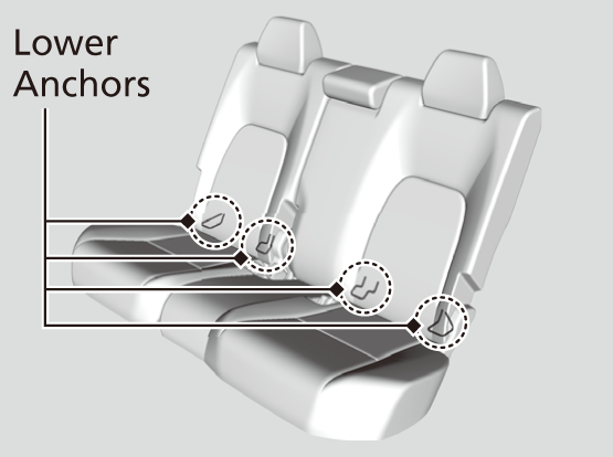 For your child’s safety, when using a child seat installed using the LATCH system, make sure that the child seat is properly secured to the vehicle. A child seat that is not properly secured will not adequately protect a child in a crash and may cause injury to the child or other vehicle occupants.Installing a LATCH-compatible child seat in the rear center seatEach outer rear seat is equipped with a pair of lower anchors which are used to secure a LATCH-compatible child seat. The rear center seat, however, is not equipped with anchors of any kind.