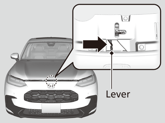 - Push the hood latch lever (located under the front edge of the hood to the center) to the side and raise the hood. Once you have raised the hood slightly, you can release the lever.