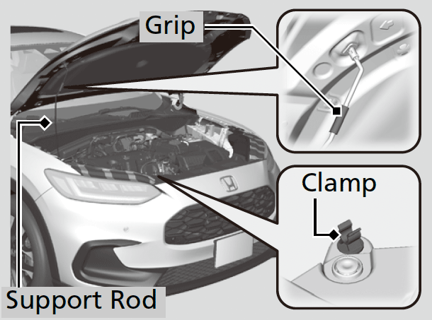 When closing, remove the support rod and stow it in the clamp, then gently lower the hood. Remove your hand at a height of approximately 12 inches (30 cm) and let the hood close.