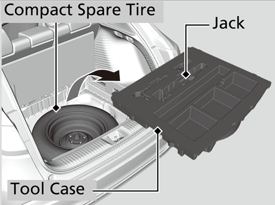 - Take the tool case out of the cargo area. Take the wheel nut wrench, jack handle bar and jack out of the tool case.