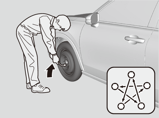 - Lower the vehicle and remove the jack. Tighten the wheel nuts in the order indicated in the image. Go around tightening the nuts two to three times in this order.Wheel nut torque:80 lbf∙ft (108 N∙m, 11 kgf∙m)