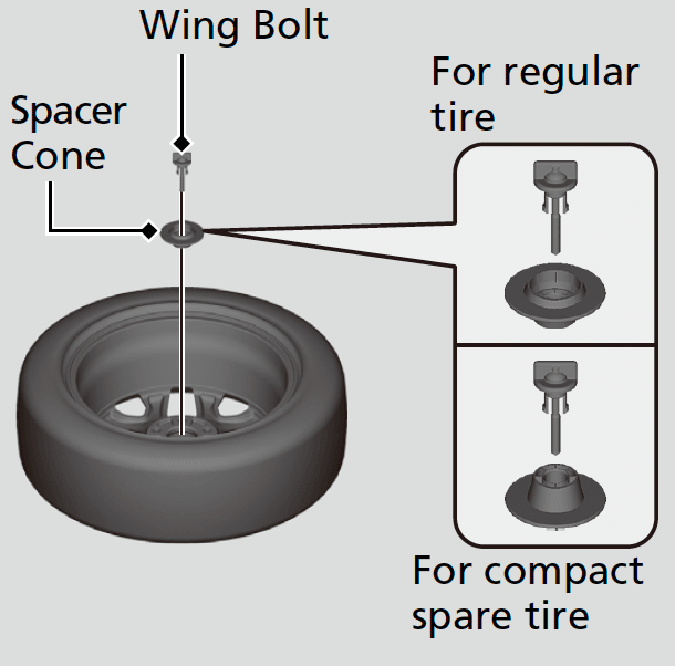 - Unscrew the wing bolt, and remove the spacer cone. Then, remove the compact spare tire.